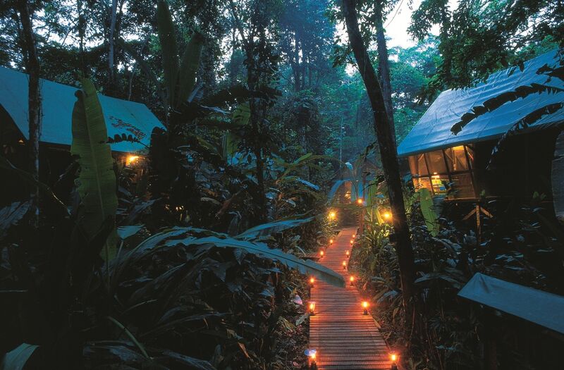 El hotel cuenta con habitaciones que se encuentran ubicadas entre árboles gigantes en un bosque tan denso que los rayos de luz casi no llegan a tocar el suelo. Cada habitación está elevada sobre una plataforma sobre pilotes, con orquídeas colgando de las ramas a su alrededor.