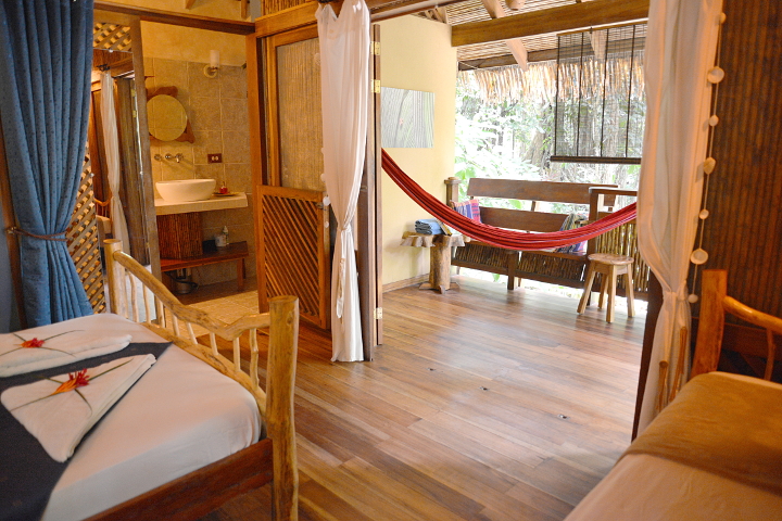The bungalows are individually crafted and aesthetically appealing. Privacy is the norm here, and each bungalow comes with a front porch that is a nice spot to relax outdoors. Comfortable beds and wooden furniture decorate the inside, and skylights let in natural light from overhead. All bungalows have a hot water bathroom, mosquito nets, and a hammock. There are also large towels for guests to use when lying out on the nearby beach.