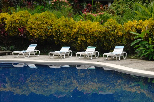 Amplias habitaciones se encuentran en un edificio largo, tiene un porche con hamacas y mecedoras.