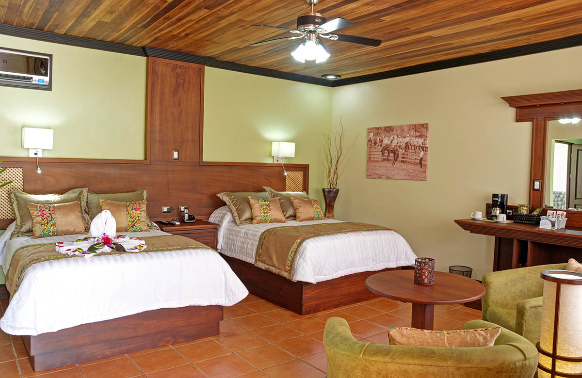El hotel ofrece a sus invitados habitaciones amuebladas con dos camas dobles o una cama tamaño King, aire acondicionado, baño privado con agua caliente, TV por cable, secadora de cabello y terraza con vista al Volcán.