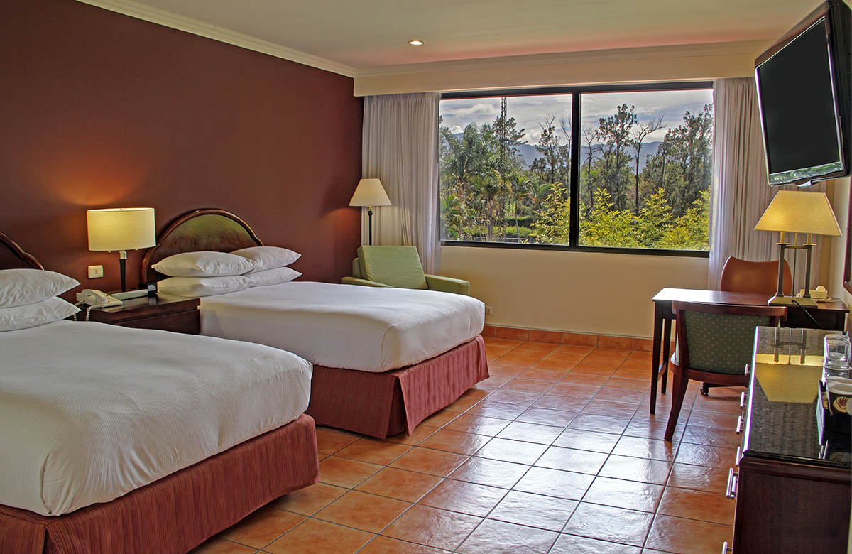 La habitación incluye caja de seguridad, reloj despertador AM/FM Doubletree con reproductor MP3, TV por cable con red en Ingles y español, cafetera con café costarricense, climatización individual, plancha con tabla para planchar y secadora de pelo. El baño combina tina y ducha.