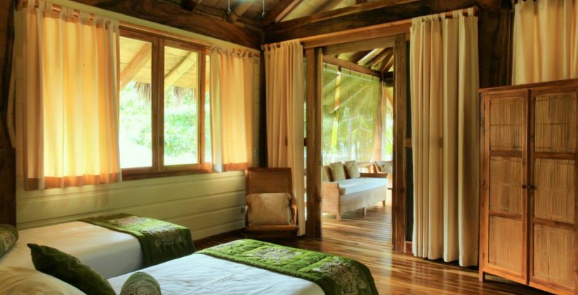 Este bungalow cuenta con una sala de estar con sofá cama, ventiladores, aire acondicionado, terraza con mesa y sillas, caja fuerte y cafetera.