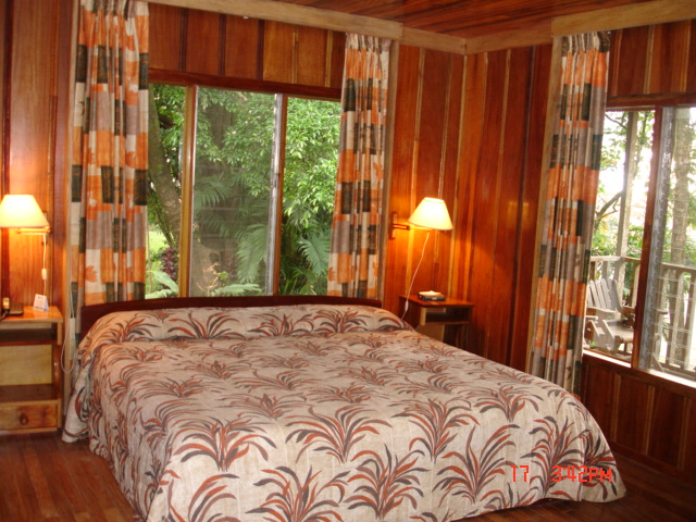 Es una habitación pequeña con una cama sencilla y una doble, baño privado, escritorio, dos sillas, dos lámparas de mesa, caja de seguridad, closet y una hermosa vista.