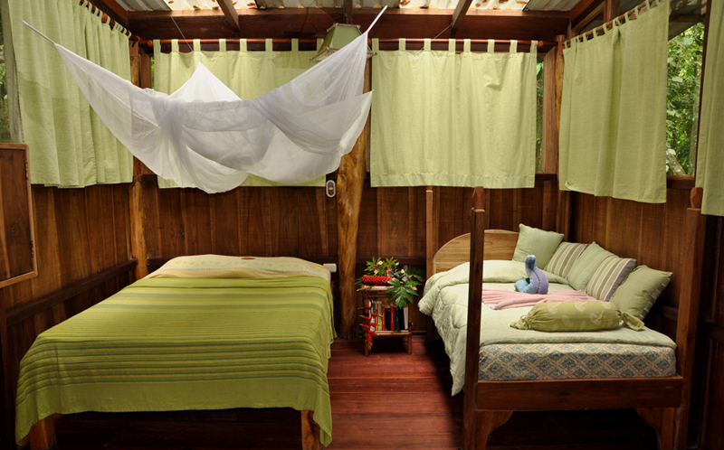 La casa del árbol tiene dos habitaciones para hasta 6 personas. La habitación de arriba tiene un baño privado y una cama doble. La habitación de la planta baja está provisto de una cama doble y una litera. Ambas habitaciones utilizan la misma ducha única, que se construye en y alrededor del árbol Sangrillo. El Tree House está equipado con una cocina privada y una habitación con aire acondicionado.